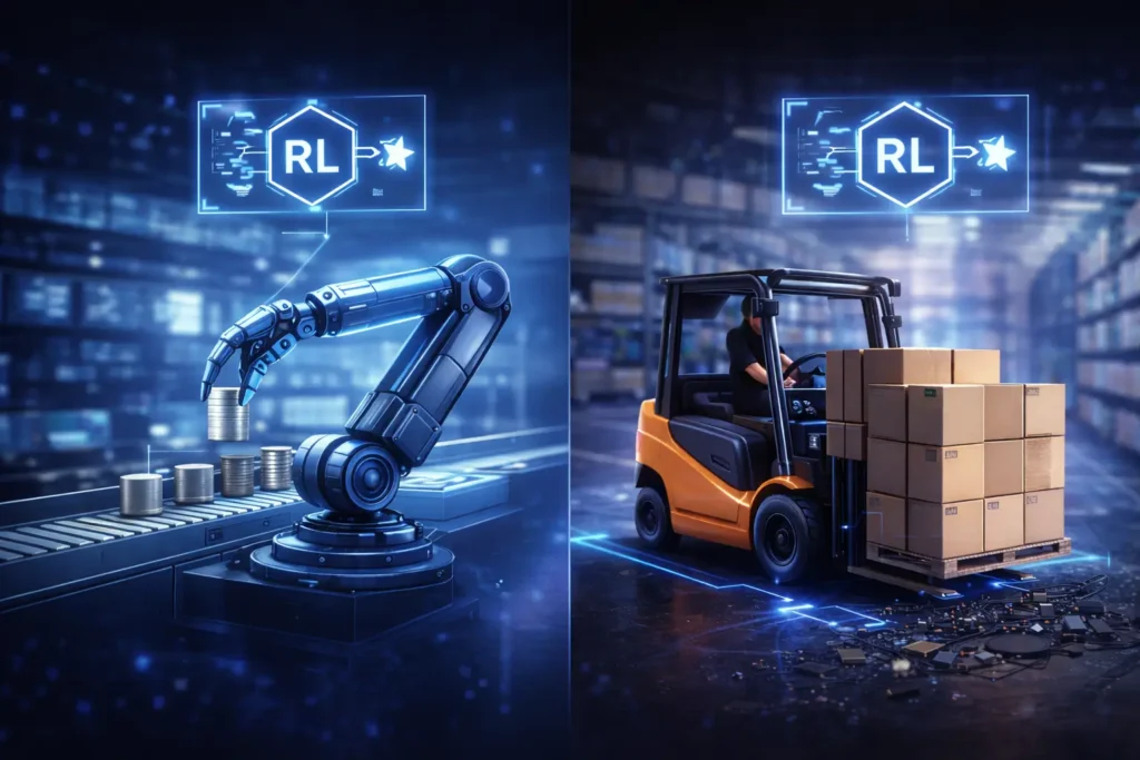 در انبارهای هوشمند و مراکز توزیع خودکار، رباتها و سیستمهای جابهجایی کالا باید در محیطهای پویا و شلوغ تصمیمگیری کنند. یادگیری تقویتی در برخی پروژههای صنعتی برای بهبود ناوبری رباتها، جلوگیری از برخورد و افزایش سرعت عملیات بهکار رفته است.