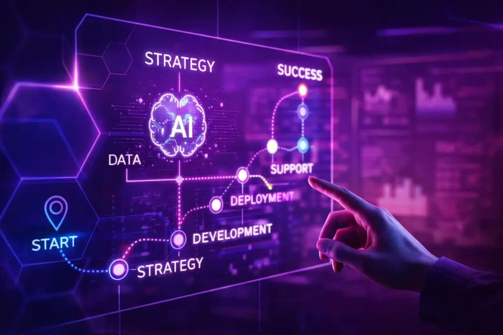 نقشه راه هوش مصنوعی سندی راهبردی است که وضعیت فعلی سازمان در حوزه داده و هوش مصنوعی، اهداف میان‌مدت و بلندمدت، موارد کاربرد اولویت‌دار، الزامات زیرساختی و برنامه‌های اجرایی برای پیاده‌سازی تدریجی راهکارهای هوش مصنوعی را مشخص می‌کند. این نقشه راه معمولاً افق زمانی چندساله دارد و به‌عنوان مرجع تصمیم‌گیری برای سرمایه‌گذاری‌ها و پروژه‌های مرتبط با هوش مصنوعی مورد استفاده قرار می‌گیرد.